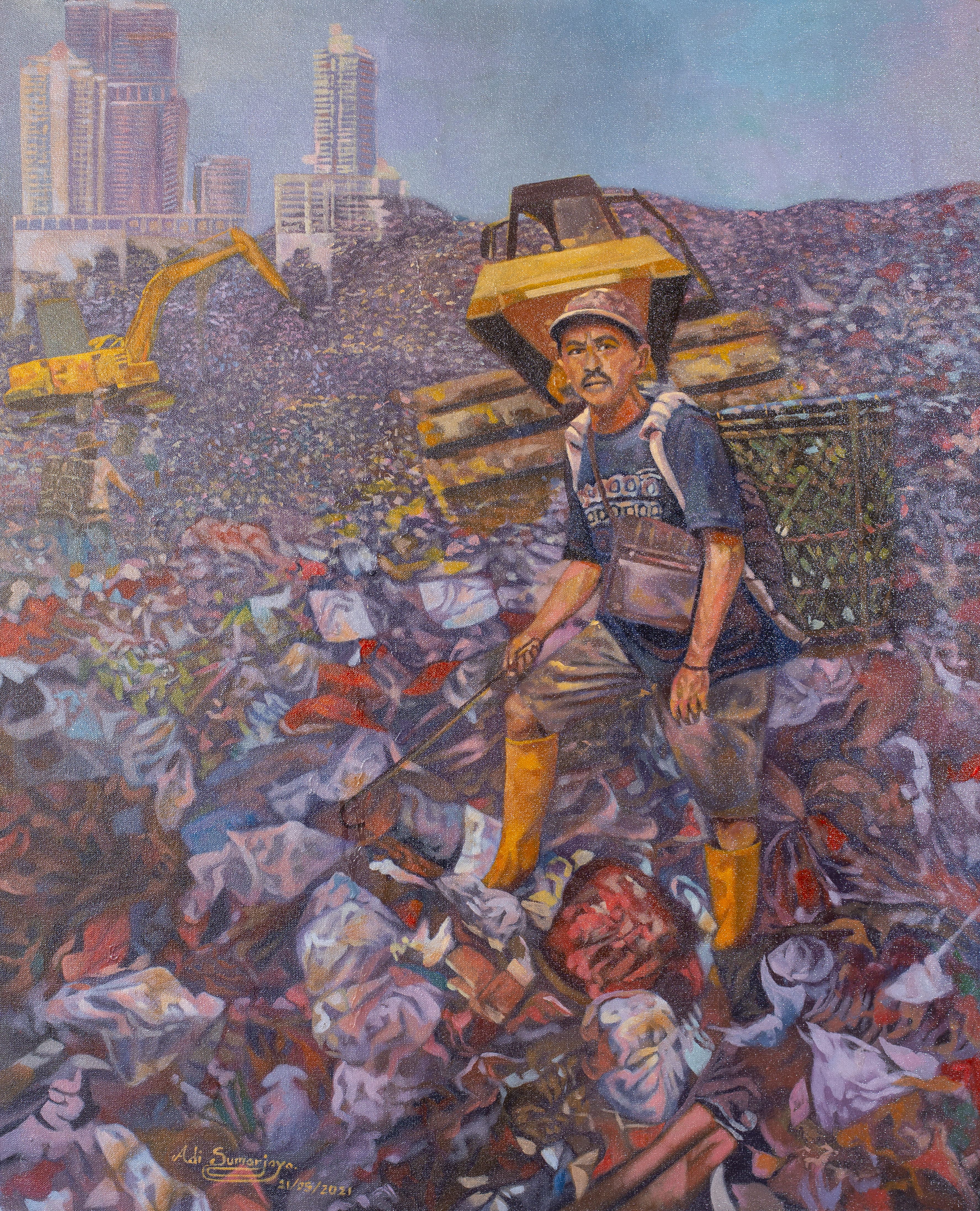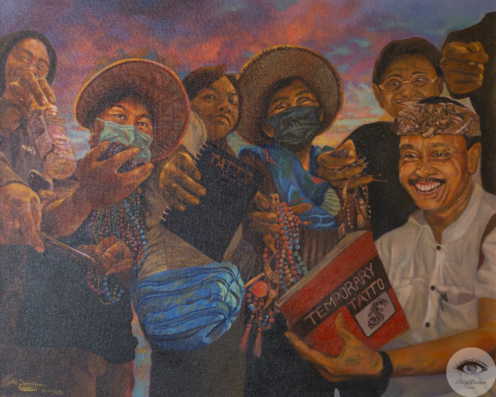 I Made Adi Sumarjaya is a realist painter from Batuan Village, Sukawati, Gianyar, Bali. His paintings revolve around the Balinese culture and his surroundings. In one of his paintings from the series of "Perjalanan Diri"/One's Journey, he depicts a Balinese vendor selling souvenirs along Kuta Beach. Here, he tries to tell the audience that a souvenir vendor is one of the livelihoods which is common in Bali.